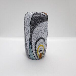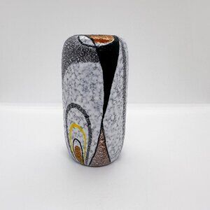 Vintage ceramic vase by Flora Plateel Gouda, from Holland Netherlands, in the Rumba pattern. This pattern was produced in the 50's/60's as one of the most popular designs and is hard to find now. A stylized mid-century modern + atomic vibe with touches of pastel colors. Signed on bottom. About 5" tall x 2" round. No chips or cracks, general wear from age.