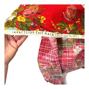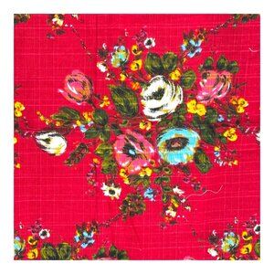 This exquisite vintage fabric showcases a vibrant floral design in rich red hues, detailed with multicolor roses. Its handmade craftsmanship ensures a unique touch, ideal for creative projects or as a decorative piece. The textile's durable cotton blend promises longevity, making it a worthwhile addition to any collection.