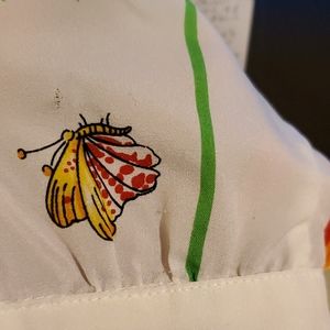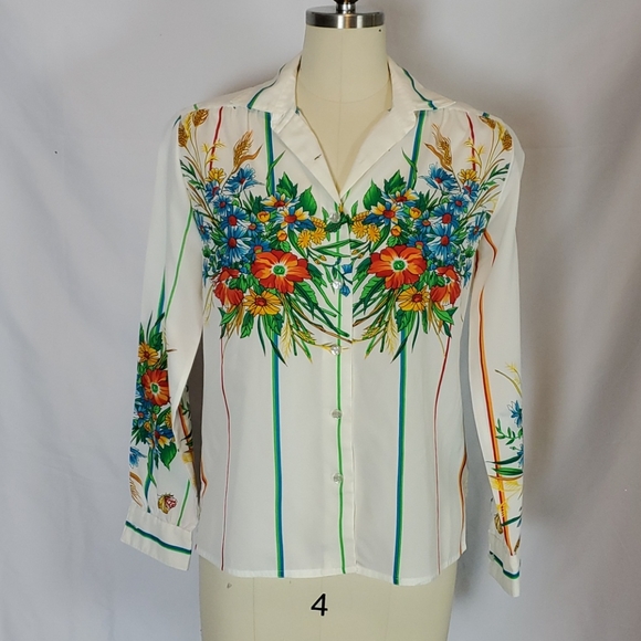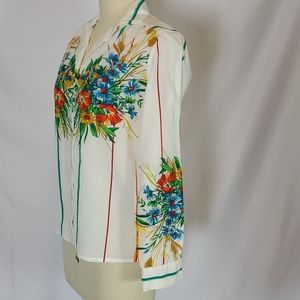 Great vintage floral print blouse, no tags, estimating a size S/M, pull as noted on front, a couple very small blemishes near one cuff, sold AS IS. Great for costume, cosplay etc. Pull really isn't very noticeable in the floral design. Lighweight slippery fabric, est circa 60s, 70s.