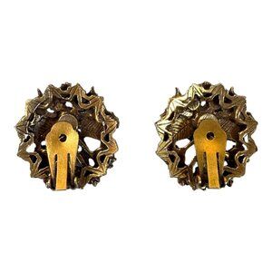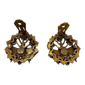 These vintage earrings offer a timeless charm with their ornate gold-tone design, faux pearls, turquoise leaves, and sparkling rhinestones, adding a touch of elegance.