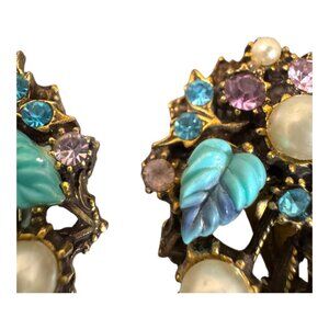 Vtg Florenza Clip On Earrings Faux Pearls Turquoise Leaves Rhinestones Art Deco