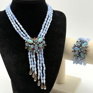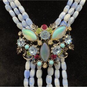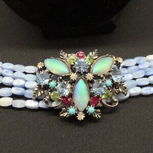 This vibrant vintage Florenza set features a multi-strand necklace and bracelet adorned with colorful glass beads and rhinestones. Perfect for adding a touch of elegance to any outfit.