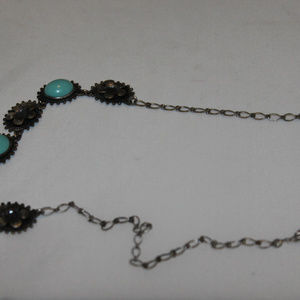 Awesome vintage floral with turquoise glass necklace. Approximately 16" total. Chain portion is about 11" total and 6 plaques about .6" each. 3 floral plaques and 3 with stones. The metal is silver tone (not sure if silver or other metal) and stone is turquoise colored - possibly glass. Wear and scratches overall, could be improved with cleaning and polishing. See additional listing for matching bracelet.