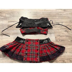 Vtg Foreplay Red Plaid Skirt & Top Set Black Lace Cross Accents M/L Punk grunge