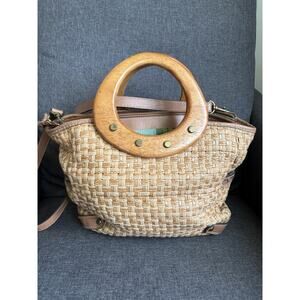 Vtg Fossil Woven Straw Brown Leather Shoulder Bag Wooden Handle Purse Key Charm