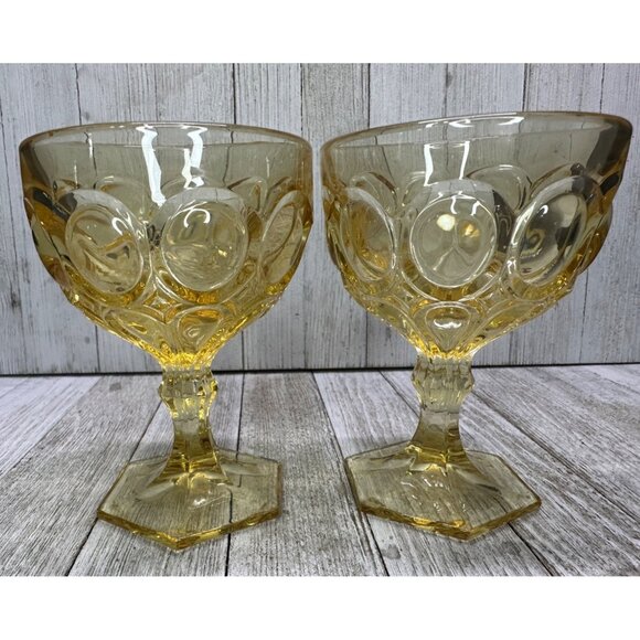Vintage Fostoria Moonstone goblets in a stunning yellow gold amber shade. Ideal for elegant occasions or collectors. Set of two, each 5 1/8" tall.