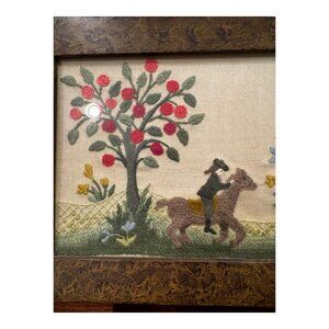 Vtg Framed Folk Art Embroidery/Crewel George Washington? On Horse Cherry Tree