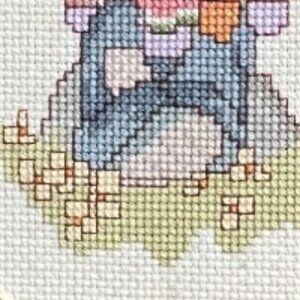 This vintage needlepoint embroidery of a child eating watermelon on a summer day is adorable. A smiling little boy or girl sits on a rock in the grass and flowers eating a large piece of watermelon while a butterfly flits above. Two small birds are also perched on the watermelon where one helps herself to a tiny bite. The details of this embroidery are fantastic, right down to the watermelon seeds. A large green mat with an oval cutout perfectly complements and sets off the artwork. It's a lovely piece that captures those carefree summer days of youth.