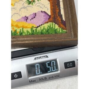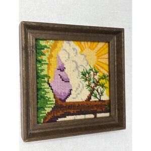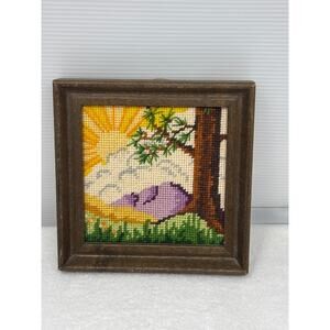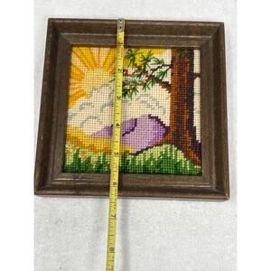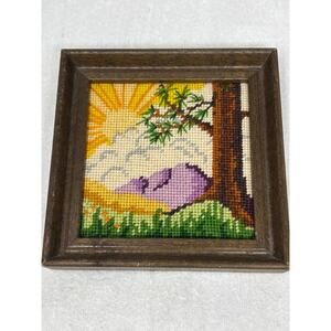 Vtg Framed Needlepoint Landscape Art Sunrise Mountain Scene Handmade Cross Stitc