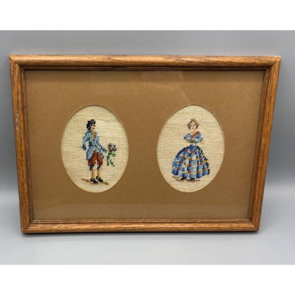 Charming needlpoint decor featuring a Victorian couple in detailed oval mats. Elegantly framed in oak, ideal for adding timeless style to walls.