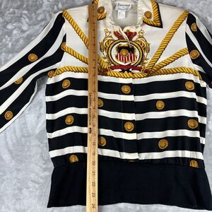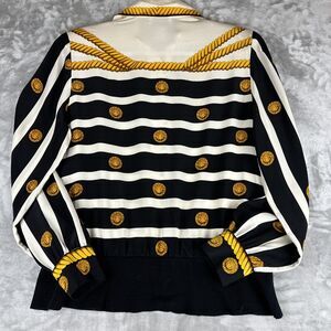 Vtg Francesca of Damon Silk Blouse Women's 4 White Black Stripe Coin Rope (0952)
