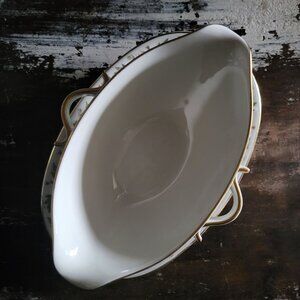 This elegant gravy boat with an attached underplate from Franconia Krautheim Selb Bavaria is a sophisticated addition to any dining collection. Its refined botanical design and classic craftsmanship make it a timeless piece. Crafted with care in Germany, it combines functionality with aesthetic appeal, perfect for serving gravies or sauces in style.