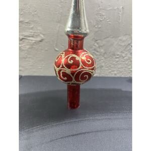 The product is a vintage 10-inch red and gold glass Christmas tree top ornament topper from The George Franke Sons Company. This hand-blown tree topper features a Frank character design and comes in its original box, making it a collectible item from the 1960s. Made in the United States, this holiday-themed ornament is a unique addition to any Christmas tree decor collection.