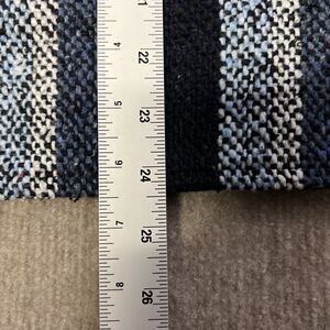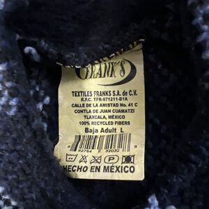 The product is a vintage Franks Textiles hoodie in a gray, blue, and black geometric pattern, with a Southwestern theme. This pullover hoodie features long sleeves, a hood, and is designed in a size L, suitable for unisex adults. Made in Mexico, this hoodie is perfect for the winter and fall seasons, adding a unique and stylish touch to any outfit with its Mexican-inspired design.