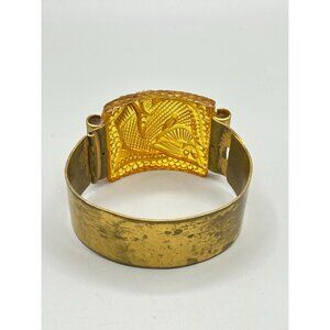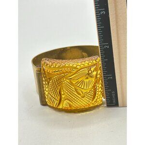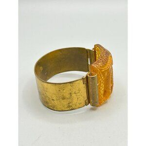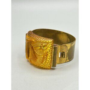 Vtg French Prystal Bakelite Carved Fish Bracelet Hinged Wide Brass Band Art Deco