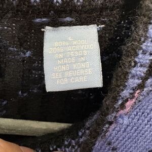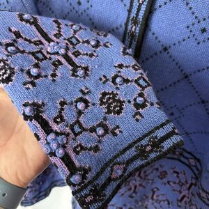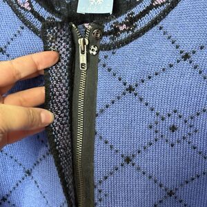 The Vtg Frost Women's L Wool Blend Full Zip Nordic Cardigan Sweater in Blue with a colorful border is a vintage piece perfect for the 90s style enthusiast. Made from a tight-knit wool blend, this crew neck sweater features long sleeves and a full zipper for easy wear. The Fair Isle pattern adds a classic touch, making it suitable for casual outings, travel, or even business settings. Add a pop of color to your wardrobe with this stylish and cozy cardigan that is sure to become a versatile staple in your closet.