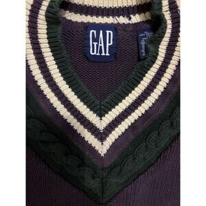 Vtg GAP V Neck Cable Knit Sweater Pullover Tennis Style Purple-Green-White XL
