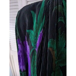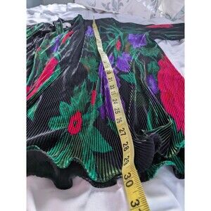 This vintage GDT Too cardigan in size XL features a colorful geometric print design in black, red, and purple, giving off a floral artsy vibe. Made from acetate spandex fabric, this slinky cardigan has a relaxed fit with long sleeves and an open front style. The liquid knit composition of polyester ensures durability, while the unique accordion-like texture adds a touch of retro charm to this versatile piece suitable for all seasons. Perfect for casual occasions, this 80s-inspired cardigan/kimono is a statement piece for women looking to add a pop of color to their wardrobe.