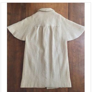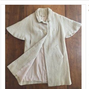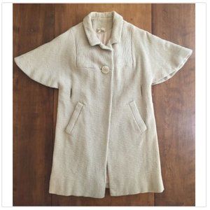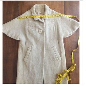 Vintage Grace Jones Salado Texas textured swing coat by high-end designer Stanley Nelson. Circa 1960's. Camel-tan. Collar, open belt slits, 2 front pockets, cape-style sleeves. Lined.Textured pearl colored button @ front closure. Hidden snap @ waist. Gathered upper back. Excellent pre-owned vintage condition. No stains, fading, odors.Small snag in liner/liner has come un-stitched on an inside hem-can't be seen from exterior & is pinned. Unknown size/fabric. Length shoulder-hem 33"