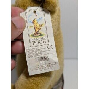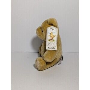 The product is a vintage GUND small classic Pooh bear plush toy, sitting in a soft and cute position. This plush toy features the beloved character Winnie the Pooh from the Disney franchise, making it a charming collectible for fans and collectors alike. With its high-quality construction and timeless design, this Pooh bear plush toy is a nostalgic and adorable addition to any Disney or plush toy collection.