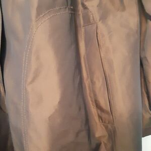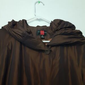 This is a vintage Gallery jacket for women in size M, with a brown solid nylon blend outer shell and polyester lining. It features a button closure, hood, and pockets, making it ideal for travel, casual, or business occasions. The jacket is lightweight and has a basic style, perfect for everyday wear.