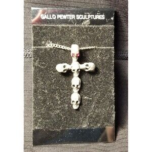 Vtg Gallo Pewter 24" Necklace Skulls Forming A Cross Pendant Red Jeweled Eyes