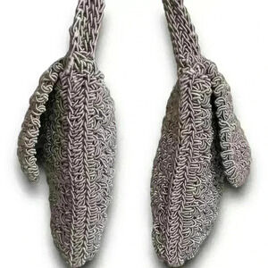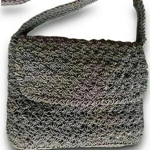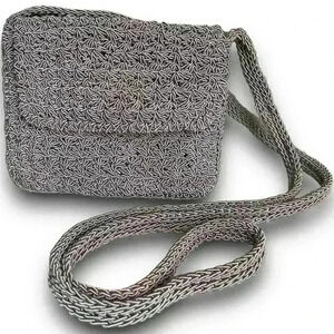 Gap vintage 1990s handknit crochet crossbody chunky woven mini shoulder bag with long strap and single compartment with a flap and snap closure. Perfect muted grey shade makes it easy to style up or down. Minor wear, nothing noticeable when in use nor does it affect the efficiency of this totes rad lil braided tote purse. Overall in excellent vintage condition!