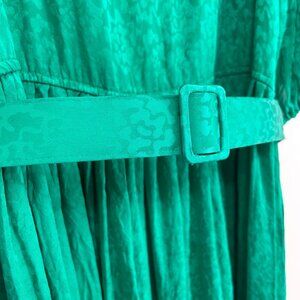 Vintage Garfinckel’s green silk midi dress with jacquard floral print, puff sleeves, pleated skirt, and matching belt. Made in Korea of 100% silk, this size 6 beauty exudes timeless elegance with its soft texture and vibrant hue. The ruched sleeves and covered button cuffs add graceful detail, while the pleating enhances flowy movement. Perfect for collectors of 1980s fashion or fans of refined vintage styling.