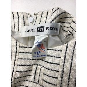 This listing is for a preowned vintage Gene Roye women's short sleeve woven blouse in ivory with black striping and quilted panel accents marked size 10, which appear to be about a size S/M.