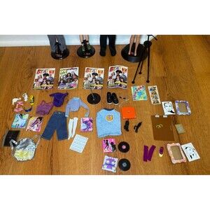 Includes: 4 dolls (Barbie, Chelsie, Nichelle, Blaine) each doll has its original magazine. Also includes accessories from Lara. Over 60 pieces total: 3 doll stands, multiple outfits, backpacks, vinyl records, 1 microphone (missing a small piece), phones, sunglasses, shoes (some shoes are missing their match), blow dryer, curlers, stickers, artwork pieces, jewelry, and more.