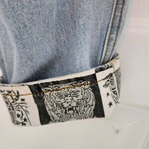 The product is a pair of vintage high waisted Get Used By Elie jeans from 1992, featuring a light wash denim fabric with a multicolor pattern. These size 29 jeans have a regular fit and a tapered style, with embroidered logo accents and a 5-pocket design. The jeans are machine washable and made of cotton denim, embodying the streetwear and hip hop themes popular in the 90s. With a high rise waist and a 31-inch inseam, these jeans are a unique addition to any woman's wardrobe, offering a blend of nostalgia and style.