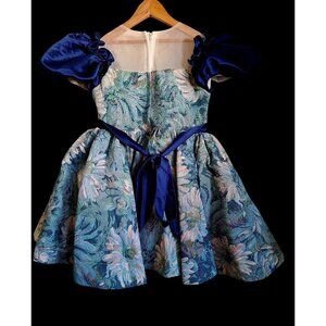 Vtg Girls Floral Tapestry Dress With Sheer Bodice & Navy Satin Puff Sleeves