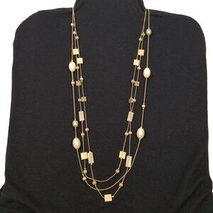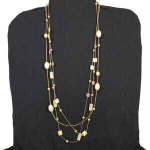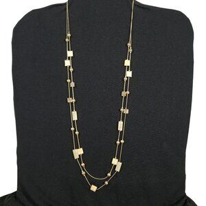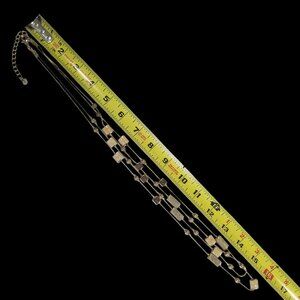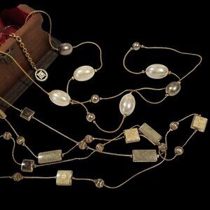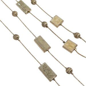 So, I paired it with this also vintage, also station, double-strand rope necklace with square and rectangular, what looks like real gold-rimmed, rainbow iridescent taupe and tan (what I think are) polished stone tiles, but could possibly be ceramic, along with little grooved gold-tone balls, and also on the same fine, twisted gold-tone chain, with a teensy rhinestone or crystal in the claw clasp. The Givenchy chain is slightly thinner, and they are not the exact same color gold if you look real close. This piece also looks great by itself as a rope or choker. But together they make even more of a statement. However, if you'd like one but not the other, put this listing in a bundle and let me know.