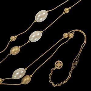 This vintage Givenchy New York Paris station necklace is from the 1980s. It has iridescent, oblong faux pearls and little gold-tone balls on a fine twisted gold-tone chain, with a teensy claw clasp and the Givenchy tag. (A station necklace is a chain that has decorative elements, or "stations, evenly spaced along its length.") It's lovely alone as a rope or doubled as a choker. But before I knew what it was, I thought it looked a bit lonesome by itself.