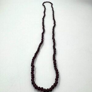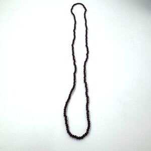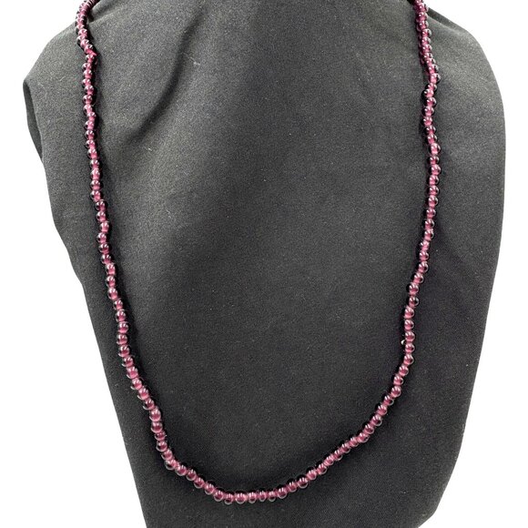 A timeless piece, this vintage necklace features rich amethyst colored glass beads with a deep hue. Its long strand design evokes elegance and simplicity.