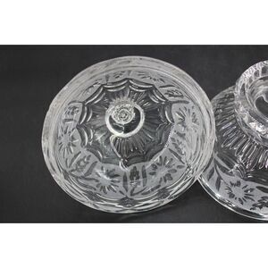 Vintage glass candy dish from the 1980s. This round, all-over etched flower candy dish features a footed design and a clear glass material. The dish is in the shape of a ball and has a glossy finish. Made in Macedonia, it showcases a pressed glass production style with the product line being Zajecar.