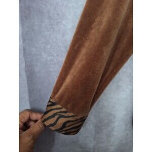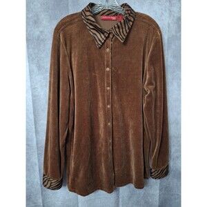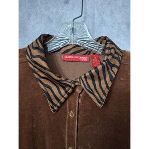 This vintage 1990's Gloria Vanderbilt velvet velour snap button front shirt in plus size 1X features a stylish zebra print trim perfect for adding a touch of personality to your wardrobe. The collared neckline, long sleeves, and easy care fabric make it suitable for various occasions such as travel, casual outings, work, or business meetings. This lightweight and breathable shirt is a versatile piece that can be worn in the fall and winter seasons, offering both style and comfort for the modern woman. PTP 24.5 in. Length 30.5 in. Sleeves 25 in.