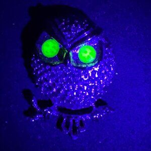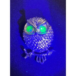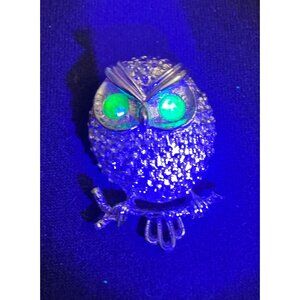 This vintage 1970's Sarah Coventry owl pin brooch is a stunning piece of jewelry that is sure to catch anyone's eye. It features beautiful round green uranium vaseline glass eyes that are set in a gold-colored metal. The owl's intricate design and attention to detail make it a coveted piece for any jewelry collector.