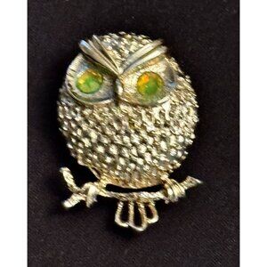 Vtg. Gold Sarah Coventry Owl Pin Brooch Uranium Vaseline Glass Rhinestone Eyes