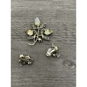 This vintage gold tone Aurora Borealis molded glass and rhinestone brooch and clip on earrings set is a stunning statement piece perfect for any occasion. The set includes a pair of earrings and features a beautiful blue main stone in a leaf shape. Made of glass and with a gold base metal, this fashion jewelry set exudes elegance and charm, ideal for women looking to add a touch of vintage flair to their ensemble.