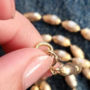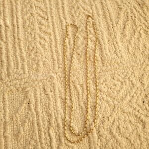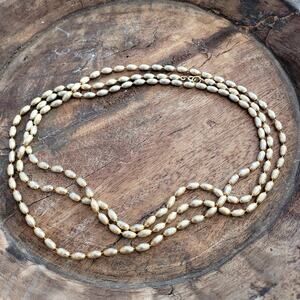 This is a beautiful vintage gold tone beaded long necklace. The beads are strung on a wire, not a string, which makes it more durable. This necklace is perfect for any occasion and would make a great addition to any jewelry collection. It's a classic piece that will never go out of style. Add a touch of vintage charm to your outfit with this stunning necklace! You'll love the way it sparkles and shines. Don't miss out on this unique and elegant accessory!