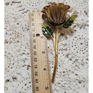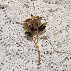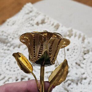 Vtg Gold Tone Filigree Rose Cloisonné Leaf 3D Rose Ornament