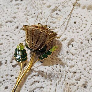 Vintage Gold Filigree Rose Cloisonné Leaf 3D Rose Ornament