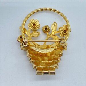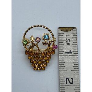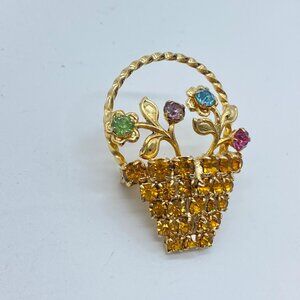 This vintage brooch features a gold tone floral basket design adorned with multicolor rhinestones.