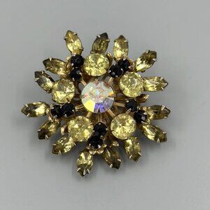 This vintage brooch features a stunning gold tone with yellow and black accents, adorned with aurora borealis crystals. The brooch is UV reactive with uranium glass, adding a unique glow under black light. Perfect for collectors and fashion enthusiasts.