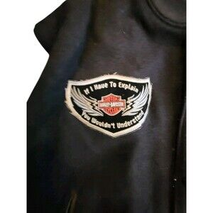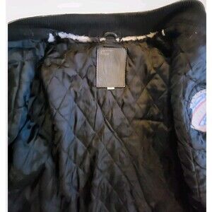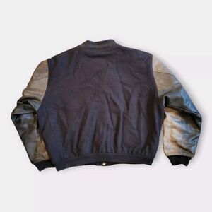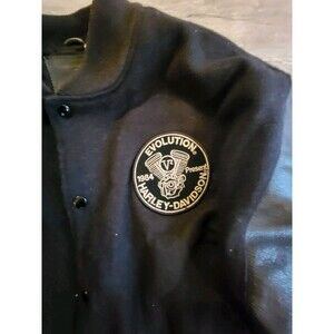 Golden Bear Varsity style heavy leather and wool jacket with 2 Harley Davidson patches on front. Used with some condition issues. Lining is torn at the top where it attaches to the neckline. Leather sleeves have some fading and wear, one sleeve is significantly more faded than the other. Wool has some pilling. Please see pictures.
