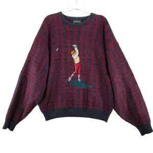 Vtg Golf Motif Knit Sweater Mens XL Maroon Red Gray Embroidered Crewneck L/S