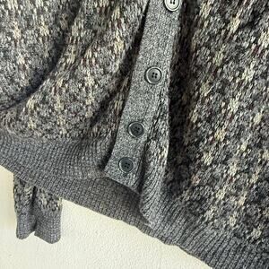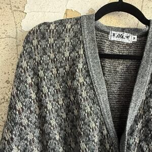 Classic late 80s early 90s grandpa cardigan in heathered greys with an allover geometric jacquard. V-neck, 5-button front, rib cuffs and hem, and a relaxed, easy fit. Feels like an acrylic blend, soft, not scratchy. The neutral palette makes it the cardigan you grab over tees, oxfords, or a turtleneck.