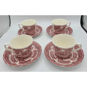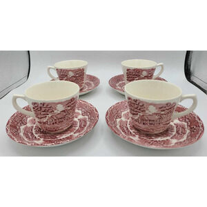 Vtg Grindley Red Staffordshire England Cups & Saucers. Set of 4. English Country