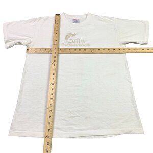 The product is a vintage Tee-Jay women's single stitch t-shirt in size L, featuring a solid white color with embroidered accents of "Girls Raised In The South." The shirt has short sleeves, a crew neckline, and is made of cotton material. Perfect for fans of southern girls and 90s style, this t-shirt evokes a sense of nostalgia and Americana flair with its themed design and classic fit. Made in the United States, this shirt is a unique addition to any wardrobe for those who appreciate vintage style and southern charm.